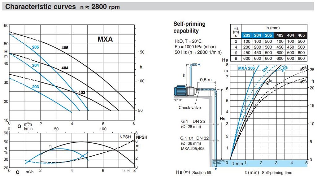 The MXA are capable of lifting water from depths of 8 m in less than 4 minutes, offers new possibilities on suction lift applications and provides better trouble free service on normal shallow-well suction lift duties, also with a long suction pipe above the water level.