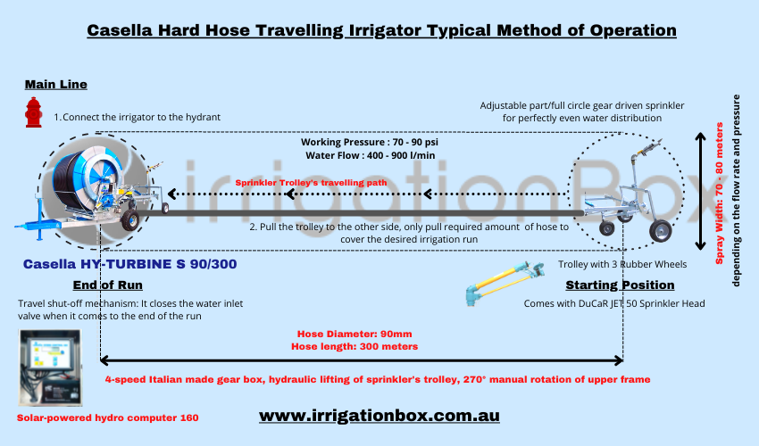 Do not buy a hard hose irrigator before comparing it with Casella's quality & efficiency! Best price guarantee, easy to use, efficient, durable, medium range irrigator.