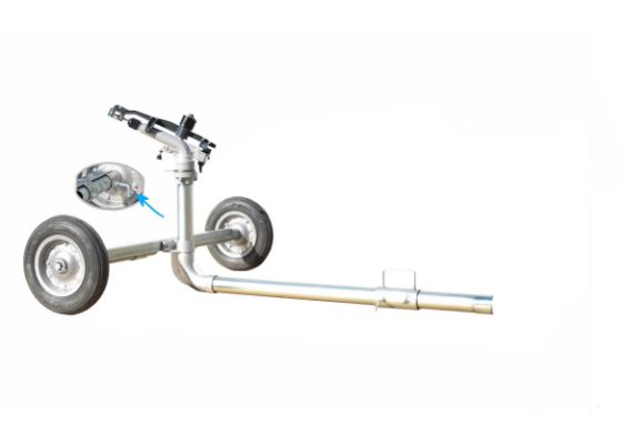 High volume impact sprinkler head with a wheeled cart! Portable long throw sprinkler cart.