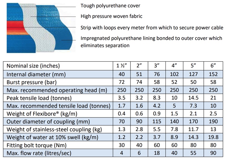 A high quality layflat bore hose that can be used for deep ground water pumping up to 250m and can swell up to 15%, making it extremely efficient in reducing pumping costs and friction loss.