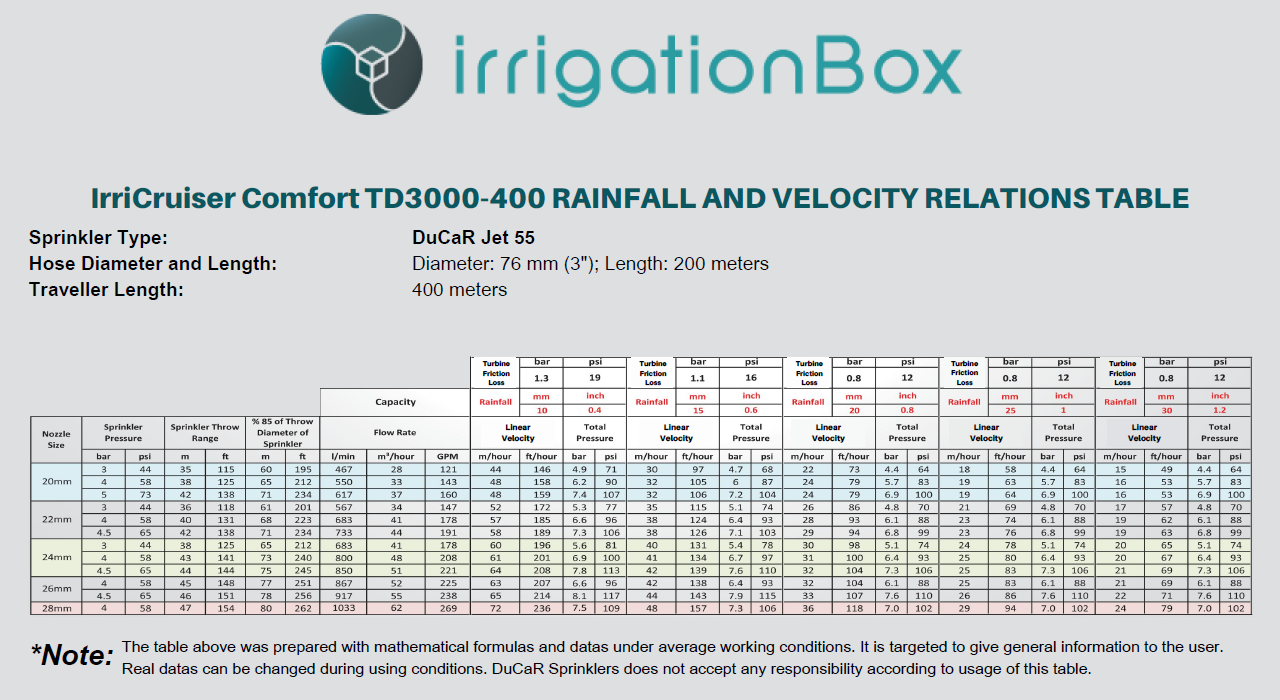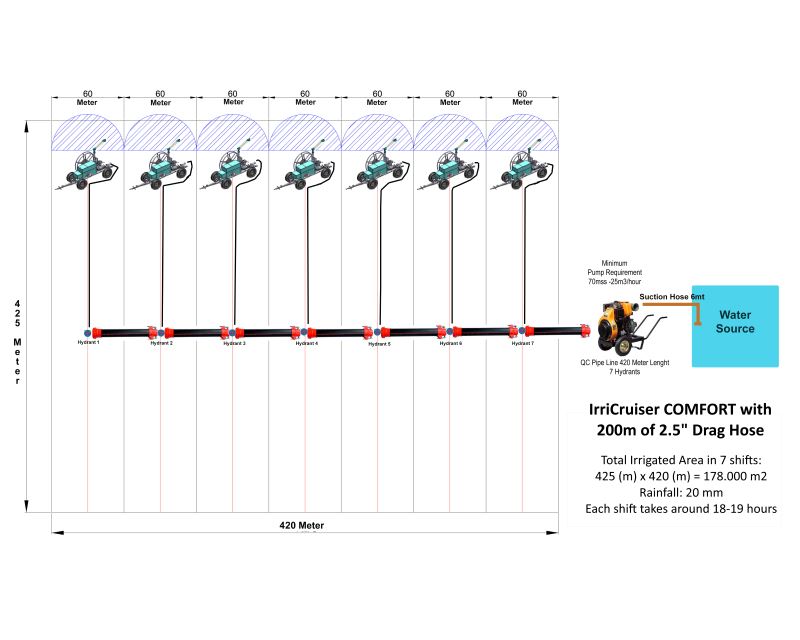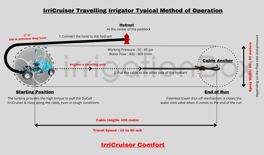 The most efficient and cost effective heavy duty, easy to use, turbine drive MEDIUM size soft hose travelling irrigator with 200 m of 3" drag hose.