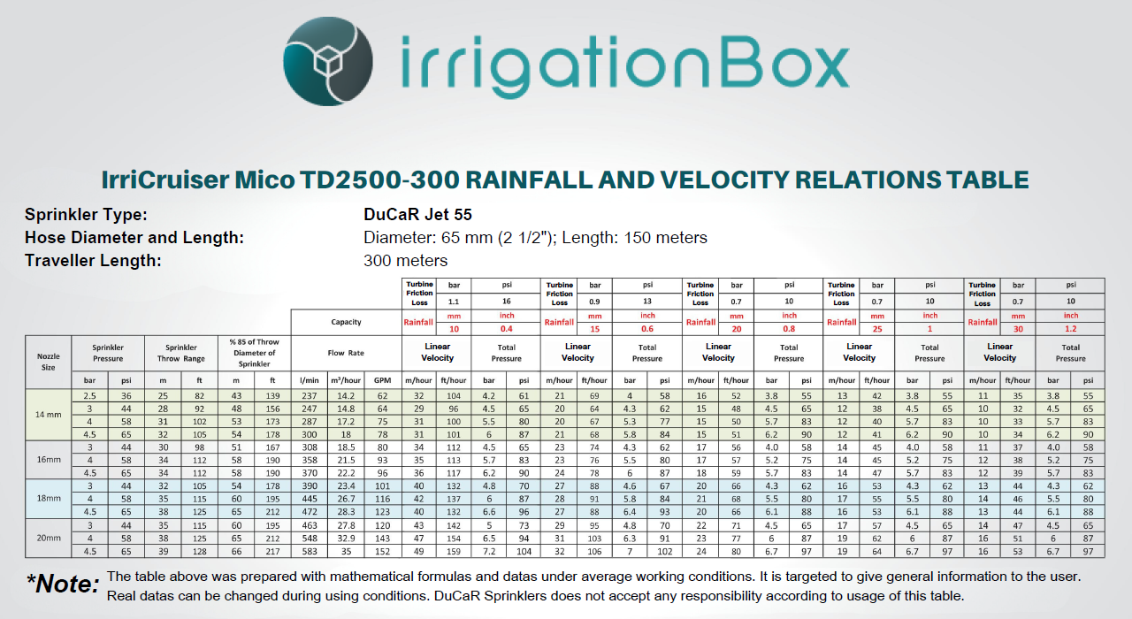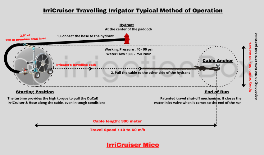 No more shifting pipes on small to medium size paddocks! IrriCruiser MICO specifically designed for low flow rate and pressure irrigation applications. Comes with 150 m of 2.5" drag hose!