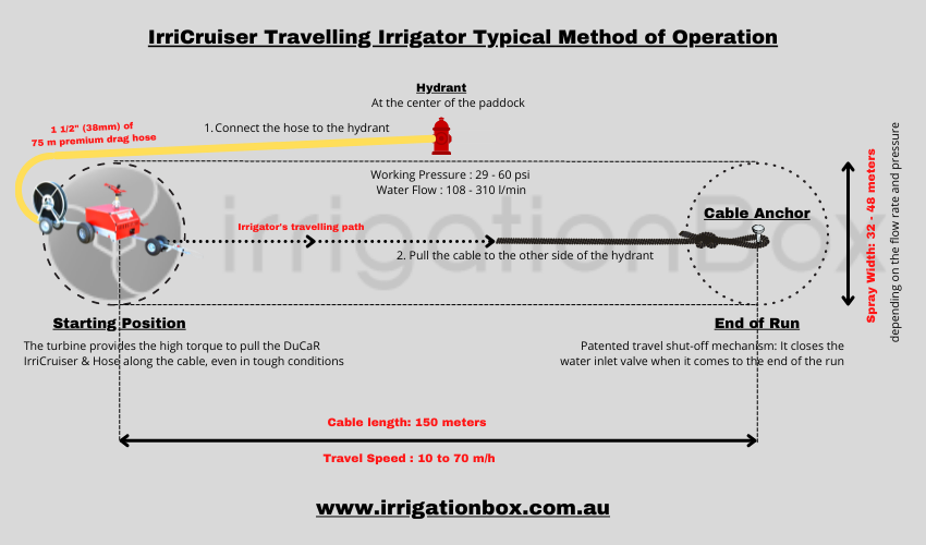 STOP wasting time to fix your pop-up sprinklers. IrriCruiser MINI is very easy to use, efficient, turbine drive, LOW-COST travelling irrigator, and is suitable for lawn, sports fields, golf, race courses and small- to medium size hobby gardens.