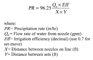 Use this first form to determine the effective application rate of sprinklers spaced at uniform distances from each other. This is particularly applicable to hand-move, or wheel-line, irrigation systems. The pressure is measured at the sprinkler