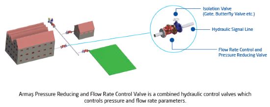 Armas Pressure Reducing and Flow Rate Control Valves, independently provides two functions. Flow control being provided with 3 way differential pilot valve on the main valve which works line pressure without any energy, pressure reducing pilot valve control the downstream pressure of main valve. Flow rate control and pressure reducing valves decrease the valve number on lines used flow and pressure control to economize.