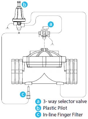 • 3-way plastic pressure reducing pilot, polytethylene plastic tubing system and nylon fittings