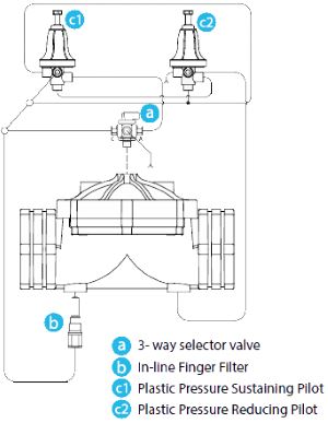 • 3-way plastic pressure reducing pilot, 3-way plastic pressure sustaining valve, polytethylene plastic tubing system, nylon fittings and 3-way selector valve