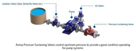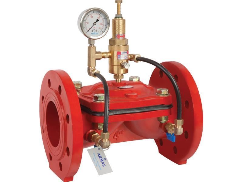 Armas Pressure Sustaining Control Valve maintains valve upstream pressure value constant. Valve is opened when line pressure reaches adjusted valve pressure level. It ensures that pump motor within pumping systems will start without load. It also prevents positive pressure waves caused by pump during start-up. Valve controls upstream pressure value continuously and keeps it in a constant value without being affected from changes in flow rates. When no flow exists, it is closed by itself as fully tightness.