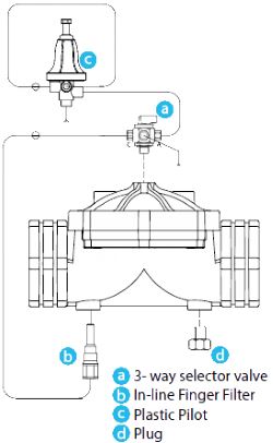• 3-ways plastic pressure sustaining pilot, polytethylene plastic tubing system and nylon fittings.