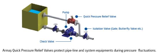 Armas Quick Pressure Relief Control Valve is the safety control valve designed to protect system by releasing pressure surges to atmosphere quickly caused from sudden changes in water speed because pumps put into/out of service frequently in water network elevation lines. When network pressure goes beyond set point, valve opens by itself quickly and protects system by releasing over pressure. When line pressure decreases to normal level, it is closed slowly and automatically as wholly sealed without causing surge.