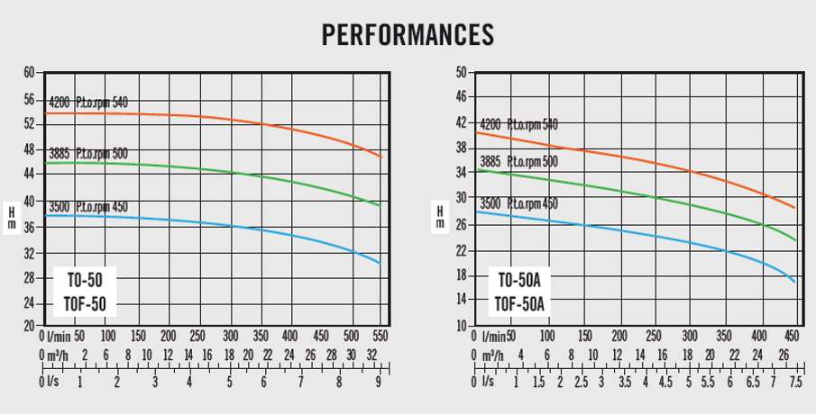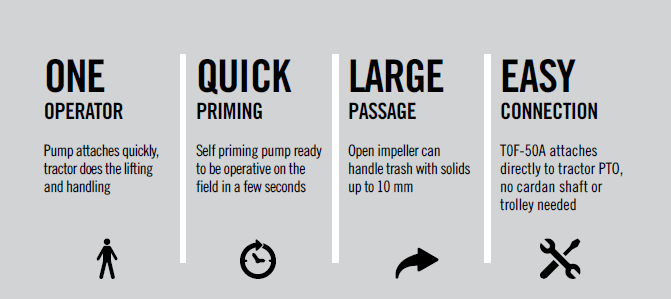 Rovatti T0F-50 series compact and portable user friendly tractor driven centrifugal pumps have been designed by ROVATTI to satisfy a wide range of applications, including water transfer, irrigation, wash-down and bowser/tank filling, etc....The selection of plastic suction and delivery fittings reduces the overall weight to allow for a rapid transfer between tractors for emergency pumping duties. Constructed from high specification cast-iron, each pump incorporates robustly engineered helical gears, oil bath lubrication of bearings and a quality mechanical seal to guarantee high efficiencies and a reliable and long maintenance free operational life. These pumps are fitted with the most modern devices and ensure an easy and reliable coupling to any type of tractor. Available both in centrifugal and self-priming centrifugal version. Each model is available both in cardan shaft driven version and with direct coupling to tractor p.t.o.