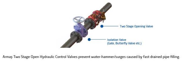 Two Stage Open Hydraulic Control Valves prevent water-hammer/surges caused by fast drained pipe filling.